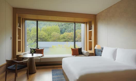 Rooms & SuitesOur hotel’s sophisticated interiors pay homage to the artist residence of the revered 16th century Japanese artist, Koetsu Honami. Relax in rich, stylish ambiance surrounded by breathtaking views of the flowing Tenjin River and rolling Takagamine foothills.