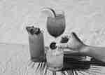 Vibrant drinks with tropical garnishes set on a palm leaf by the pool from the Oasis Bar & Grille.
