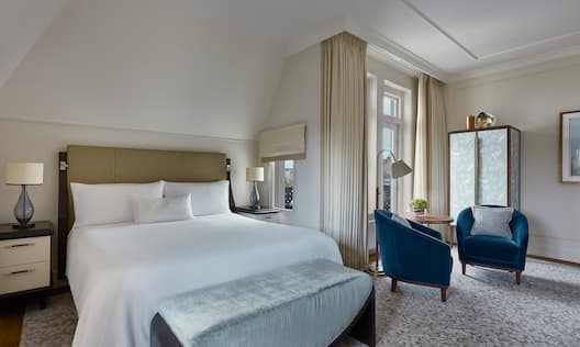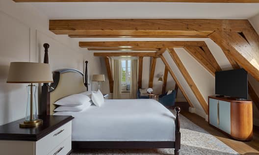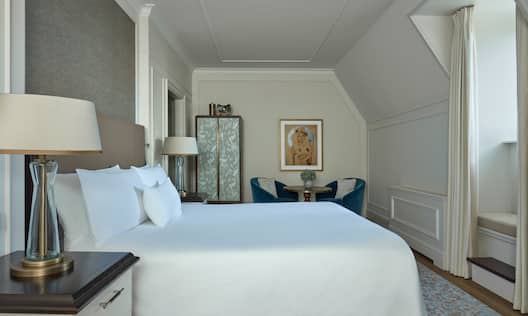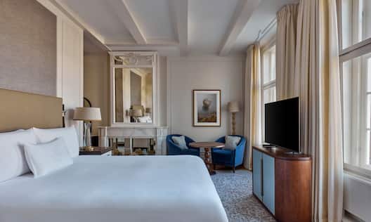 Menginaplah di lantai teratas hotel di Loft King kami yang mewah. Dengan balok kayu tradisional, langit-langit miring, dan dekorasi elegan, kamar ini menawarkan masa inap unik di jantung Amsterdam.